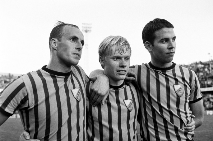 En Djurgården-trio efter derbysegern mot AIK 1968 med 4-0. Från vänster Sven Lindman, Conny Granqvist och Claes Cronqvist.
