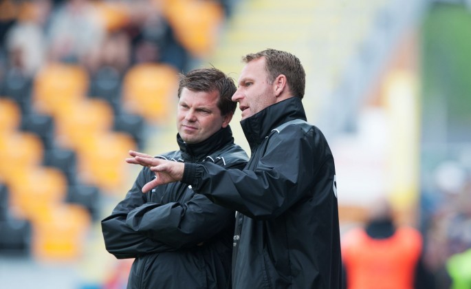 Torbjörn Arvidsson och Jens Gustafsson i samspråk under deras gemensamma tid i HBK 2013.