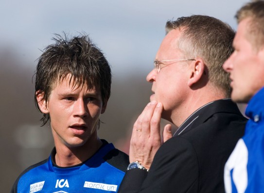 Eng ung Dusan Djuric samtalar med Janne Andersson, medan lagledaren Anders Smith lyssnar.