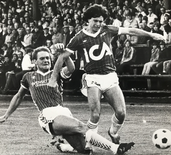 Janne är den spelare som spelat flest A-lagsmatcher i HBK - hela 557 st. Här i en duell med en Bragespelare på Örjans vall i början av 1980-talet.