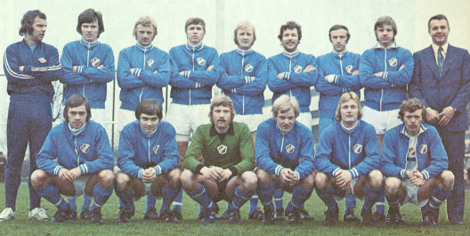 Första matchen i Allsvenskan 1972 borta mot Malmö FF. Bakre raden fr v Bernt Andersson, Ingvar Andersson, Lars-Göran Karlsson, Tommy Södergren, Ingvar Sandberg, John Lindau, Lars-Erik Larsson, Sylve Bengtsson. Främre raden fr v Roland Fransson, Lennart Alexandersson, Thomas Eriksson, Jan Nissmo, Bengt-Göran Svensson och Ulf Alexandersson.